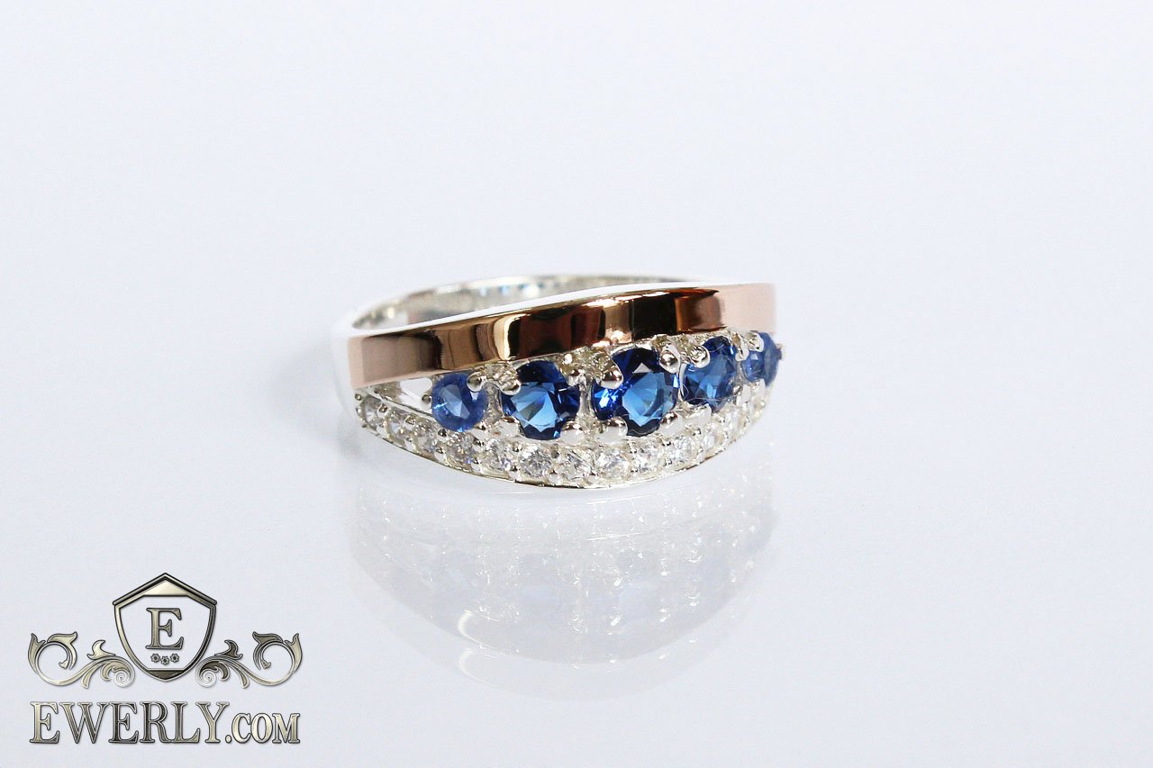 Женское серебряное кольцо 925 пробы с золотой вставкой 375 пробы с синими камнями.