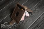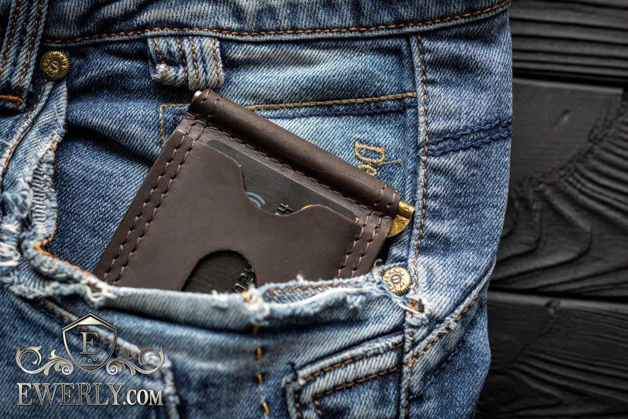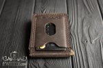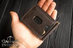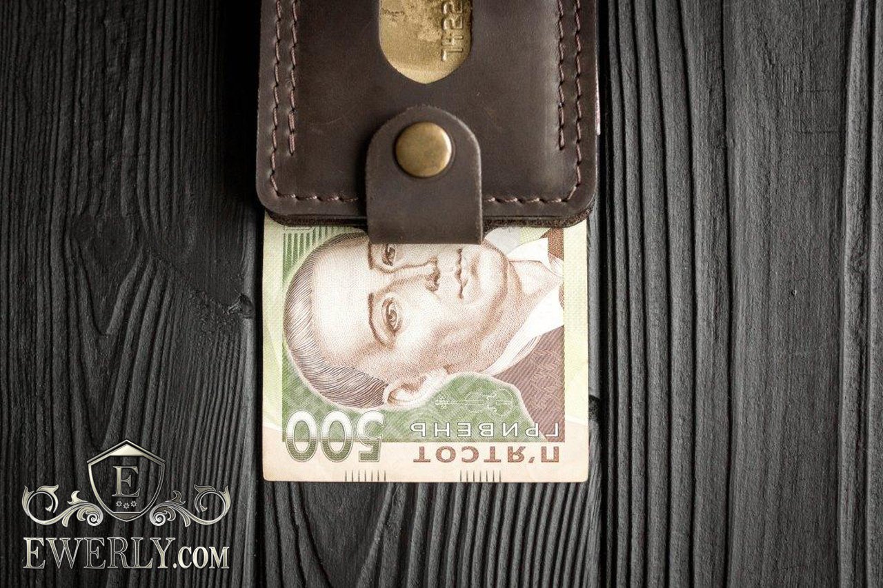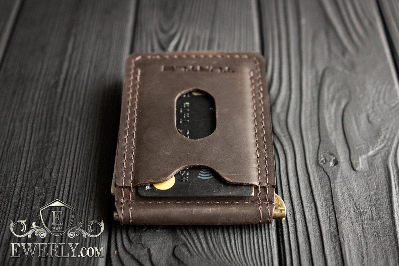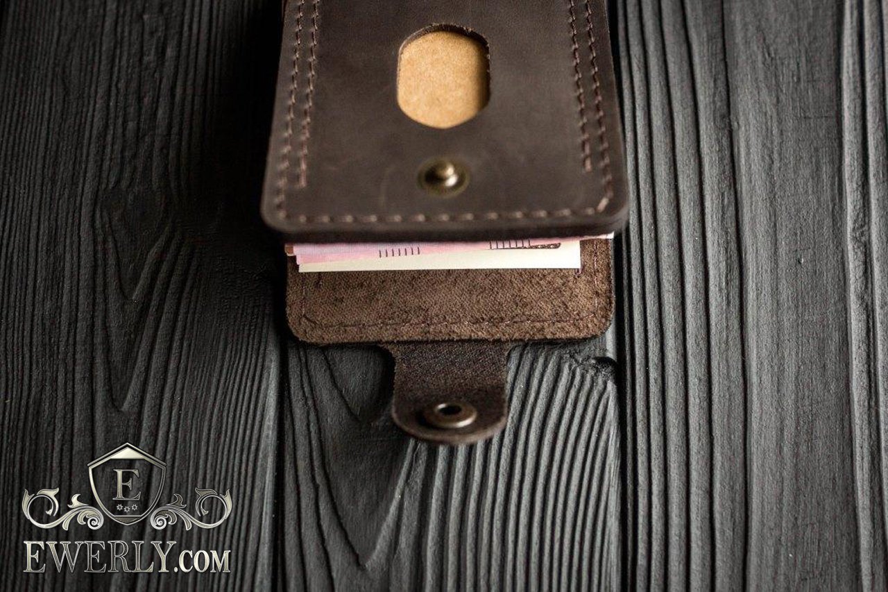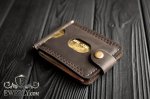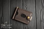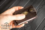 Мужской кожаный зажим для бумажных денег - изделие полностью ручной работы, изготовлен из натуральной кожи коричневого цвета. Имеет три раздела, два внешних из них для банковских карт или визиток и одно внутреннее отделение для купюр всех номиналов, в том числе самых крупных.